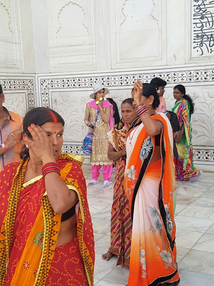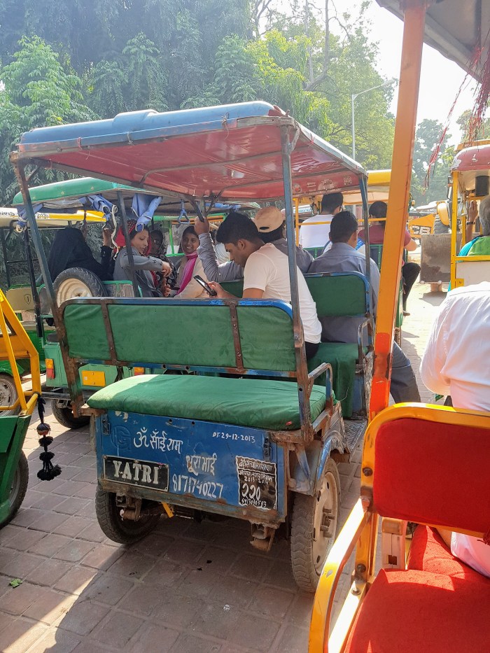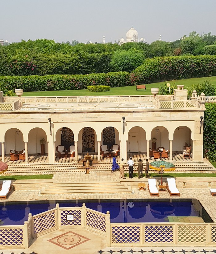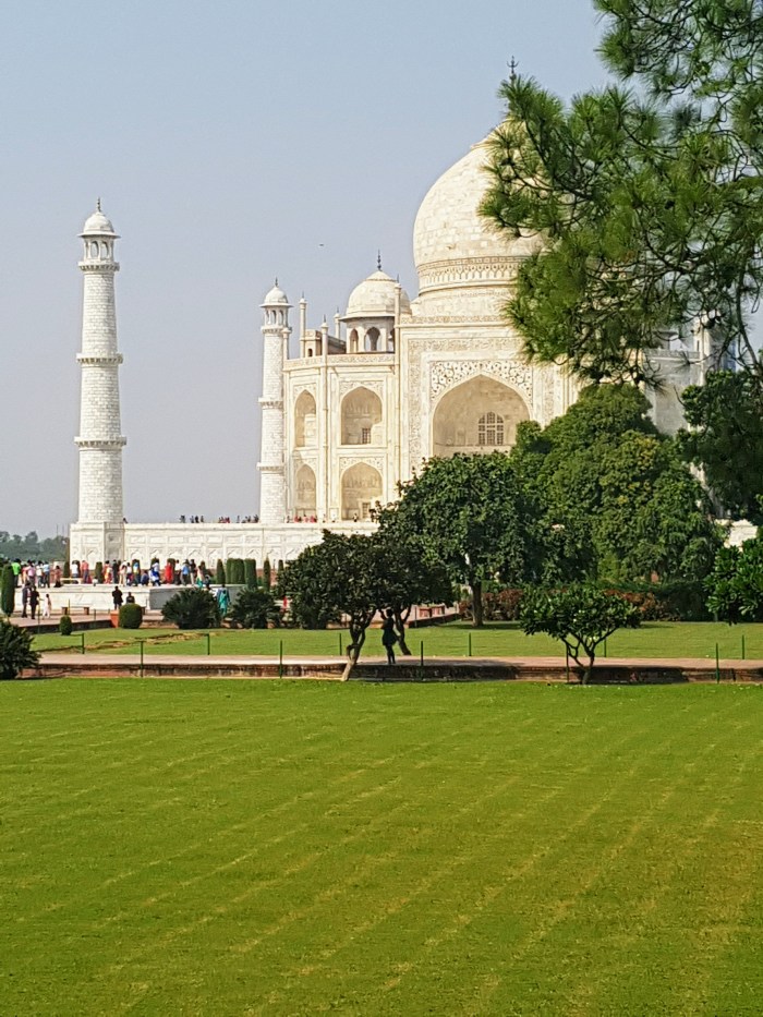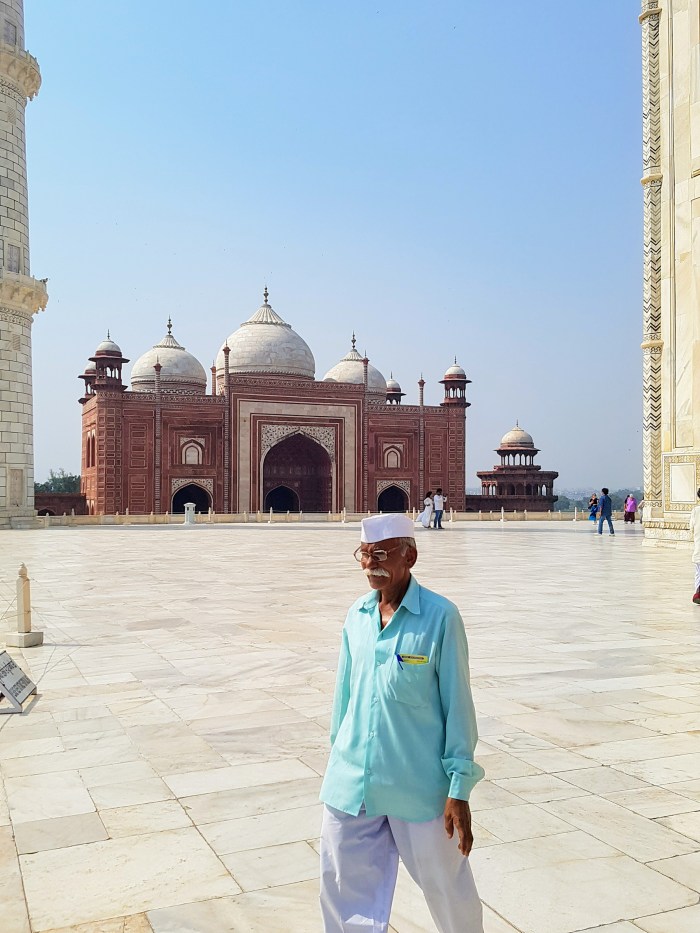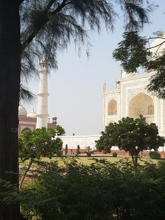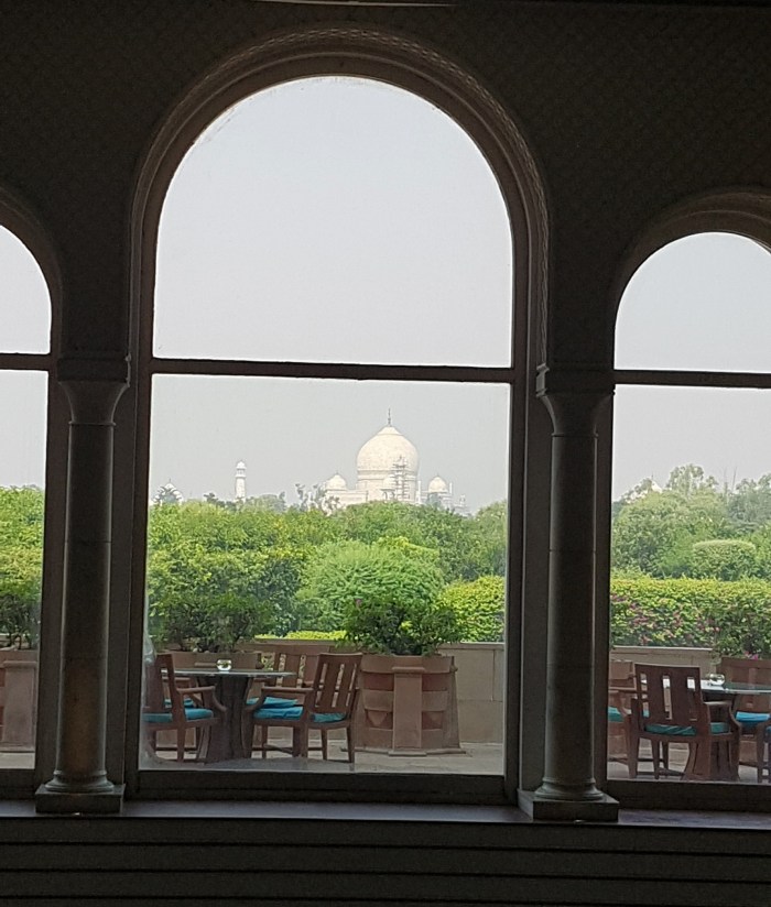 Laura planejara um café da manhã indiano em um hotel perto do monumento. Do terraço, tem-se uma vista espetacular sobre o Taj Mahal. Depois da refeição pegamos, na porta do hotel, um trenzinho à disposição dos hóspedes que leva até o portão de acesso ao complexo do mausoléu.