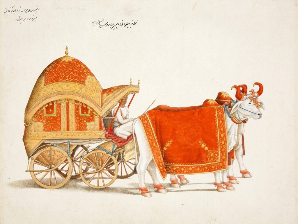 De todas as obras expostas no museu, a que mais me intriga é talvez uma aquarela intitulada A carruagem puxada por bois do príncipe Mirza Babur. Esse príncipe era um dos muitos filhos do penúltimo imperador mogol, Akbar II. Morreu em 1835, aos 38 anos. Viveu durante os estertores do outrora poderoso império de seus antepassados, fundado no século XVI por Babur, o descendente dos temíveis Tamerlão e Gengis Khan. Em 1857, os ingleses poriam fim oficialmente à dinastia, depondo o último imperador, Badur II, outro soberano poeta, irmão de Mirza Babur. A rainha Vitória se tornaria Imperatriz da Índia em 1876.