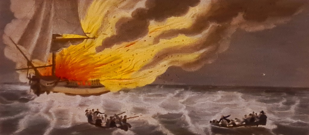 O grito de “fogo!” foi ouvido a bordo às oito e vinte da noite, a 80 quilômetros da costa. Dez minutos depois, com o navio já em chamas, os passageiros e a tripulação, 41 pessoas ao todo, estavam em dois botes no mar. Ao abandonar o barco, o comandante levou uma bússola. A luz do próprio incêndio, que ficou queimando até a meia-noite, também ajudou os remadores a colocar os botes no rumo certo. Na descrição de um viajante ilustre, no final do incêndio o salitre que o navio transportava iluminou o horizonte inteiro: “one of the most splendid and brilliant flames that ever was seen, illuminating the horizon in every direction, to an extent of not less than fifty miles”.