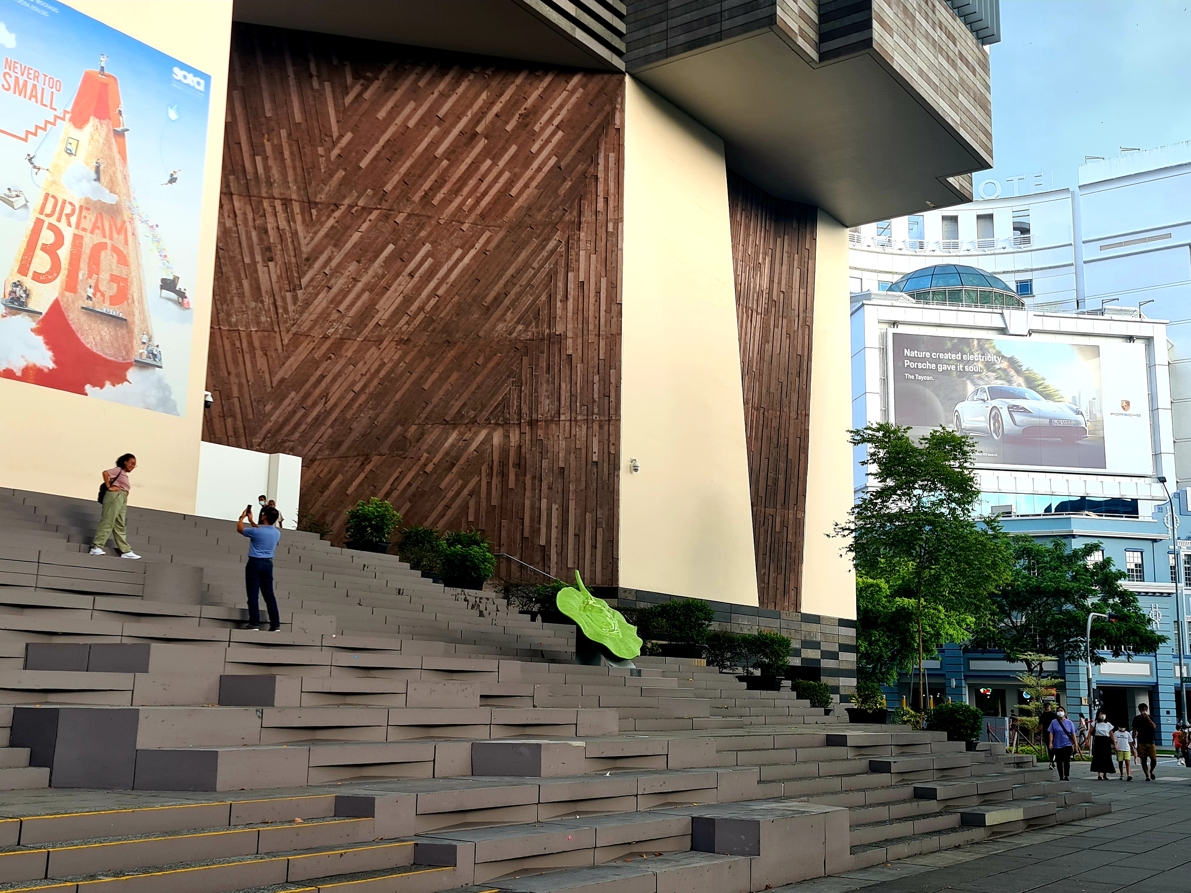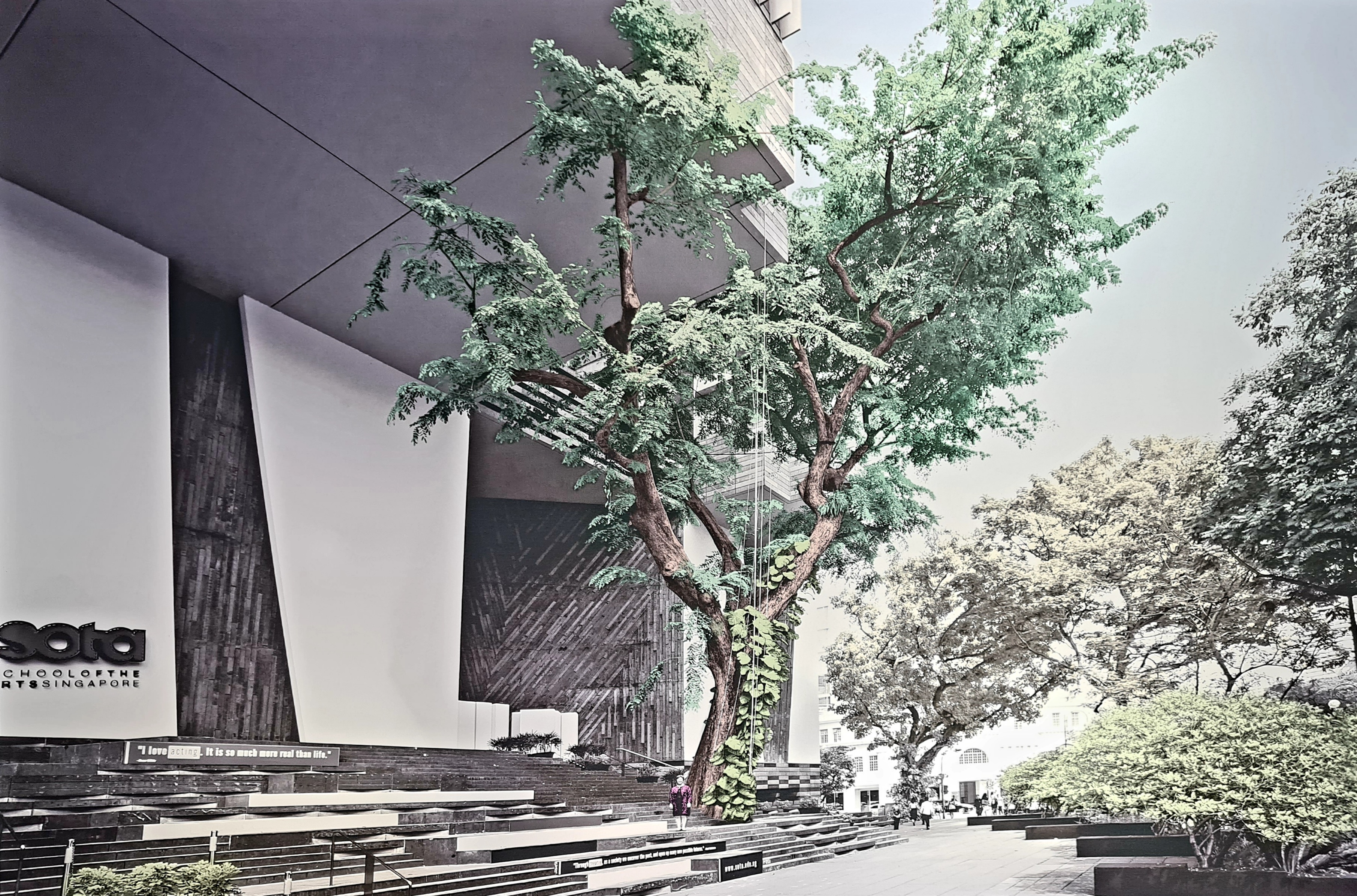 Fiquei incomodado de não ter notado a árvore, ao passar frente ao prédio. Mais tarde, em casa, descobri que ela na verdade já não existe. Foi abatida em 2018, porque seu estado de conservação precário — tinha 40 anos segundo a imprensa, 60 segundo Robert Zhao — colocava em risco a segurança dos alunos. A retirada da angsana, tratada como celebridade, foi extensamente divulgada na época. Houve homenagens nos dias anteriores. Alunos e professores despediram-se da grande árvore. Passando frente à Escola de Artes uns dias depois, notei que, no lugar onde existira a angsana, há agora uma escultura verde, no degrau, representando a sua semente. Não se pode deixar de respeitar uma sociedade que homenageia com uma escultura o exemplar específico, desaparecido, de uma árvore.