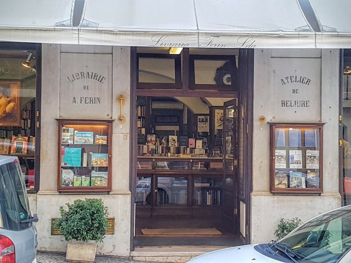 Saindo da Bertrand, se desço a Rua Garrett e viro à direita na Rua Nova do Almada, chego à Livraria Ferin, a segunda mais antiga da capital. Esse é, por excelência, um lugar elegante, e me lembra duas de minhas livrarias preferidas, a Galignani em Paris e a Hatchards em Londres. O ambiente é acolhedor, e a oferta de livros, inclusive franceses, é sempre interessante, particularmente na área de história. Minha única queixa não é culpa da livraria: é que sonho, até hoje inutilmente, em conseguir fotografar sua fachada sem carros estacionados em frente. Já me aconteceu de ficar longos momentos na calçada oposta, celular à mão, esperando poder captar um momento em que a rua estivesse despejada. Já me aconteceu também de pensar, nessas horas, que os funcionários da Ferin, se me notaram alguma vez, pela vitrine, parado na rua, olhando insistentemente em direção ao prédio, devem ter estranhado ou mesmo ficado preocupados. A rigor, a fachada da livraria em nada se diferencia, arquitetonicamente, das demais nessa rua pombalina. É bem mais sóbria do que a da Bertrand com seus azulejos azuis. Mas algo ali me atrai, talvez o que sei do ambiente atrás da porta; ou talvez a forma arqueada como a palavra “Librairie” é gravada, na pedra do lado esquerdo da porta, sobre o resto da inscrição, “de A. Ferin”. No pilar do outro lado da porta está gravado “Atelier de reliure”, com a palavra “Atelier” também arqueada.