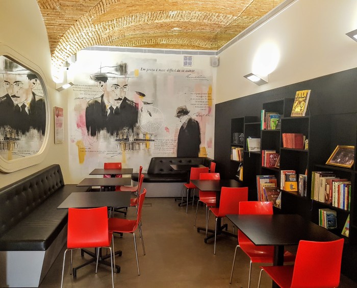Na minha primeira viagem a Portugal, aos 19 anos, adotei a Bertrand. Como eu quase sempre me hospedo no Chiado, ela me serve como uma mistura de livraria e de espaço prático para fazer uma pausa do sol, do calor, do frio, da agitação; para entrar, isolar-me do mundo por alguns minutos em um ambiente conhecido, seguro, e voltar a sair, com renovado entusiasmo. Na sala principal, a primeira, passei já muitas horas da minha vida. Mais adiante, a cavernosa enfileirada de arcos sugere a promessa de tesouros a serem descobertos. Mesmo uma livraria fundada em 1732 e instalada em 1773 no local atual, na Rua Garrett, pode nos reservar surpresas. Em 2017, descobri que os sucessivos ambientes desembocam agora em um café, com um mural representando Fernando Pessoa.